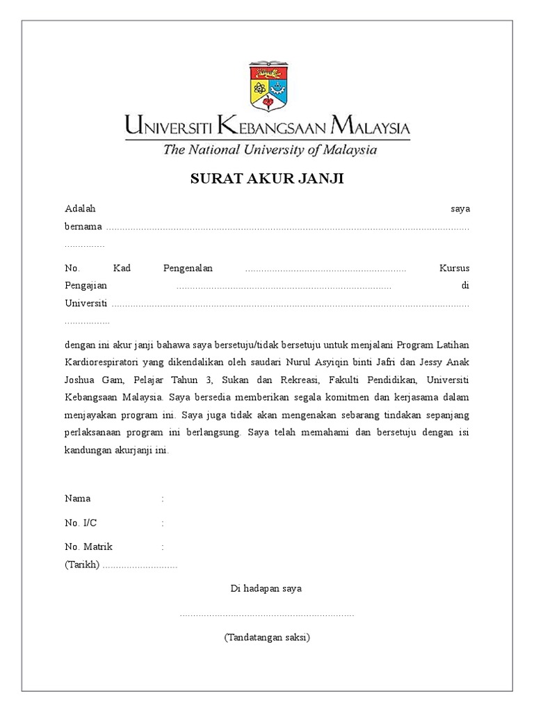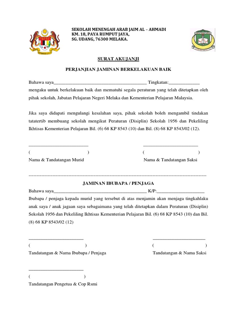 Dengan sesungguhnya berjanji bahawa saya akan mematuhi peruntukan Peraturan-peraturan Pegawai Awam Kelakuan dan Tatatertib 1993 Perintah-perintah Am pekeliling dan surat pekeliling serta apa-apa peraturan dan arahan lain yang dikeluarkan dan dikuatkuasakan oleh Kerajaan dari semasa ke semasa sepanjang. Terpakai kepada pelajar pelajar kolej taj yang dibuat dari semasa. Beberapa Contoh Surat Aku Janji Pembelian Terlengkap 2019.